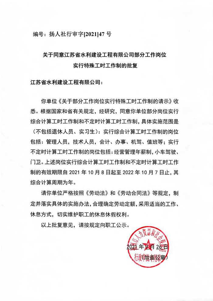 關(guān)于同意江蘇省水利建設(shè)工程有限公司部分工作崗位實(shí)行特殊工時(shí)工作制的批復(fù)