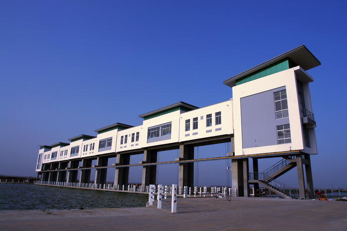 以海口樞紐為主要控制建筑物的新沂河整治工程集防洪、生態(tài)、景觀于一體,造型美觀,視覺豐富,景色優(yōu)美,以其嶄新的姿態(tài)靜臥于淮北大地,保護著駱馬湖周邊和沂南、沂北八百多萬畝耕地、570萬人民生命財產(chǎn)安全,同時還改善了淮北地區(qū)的生態(tài)條件,更可與通榆河相連,實現(xiàn)水資源的優(yōu)化調(diào)度。